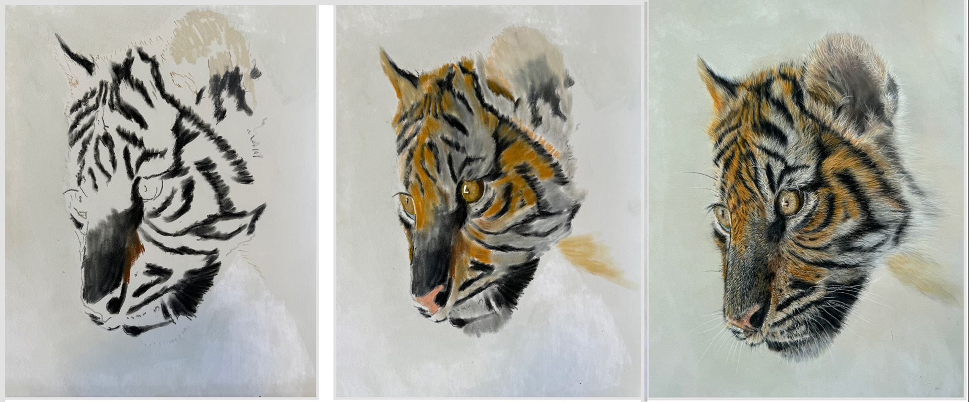 For pastel paintings, base layers and background are painted using a 'sofft' sponge with soft pastels & panpastels to define shape and colours. Pastel pencils are then used to gradually build up layers and depth to give a more realistic look, taking 2-3 weeks for each painting.
